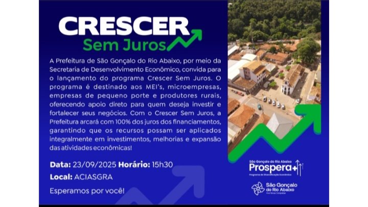 A Prefeitura de São Gonçalo do Rio Abaixo, por meio da Secretaria de Desenvolvimento Econômico, lança no próximo dia 23 de setembro o Programa Crescer Sem Juros, iniciativa inédita voltada para impulsionar microempreendedores individuais (MEIs), micro e pequenas empresas, empresas de pequeno porte e produtores rurais do município.