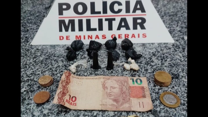 Diante da atitude suspeita, ele foi abordado e, no local onde ele havia dispensado o material, foram coletados 8 buchas de maconha, 2 pinos de cocaína e 3 pedras de crack, além de R$12,40 e um cordão dourado, que o abordado não soube informar a procedência.
