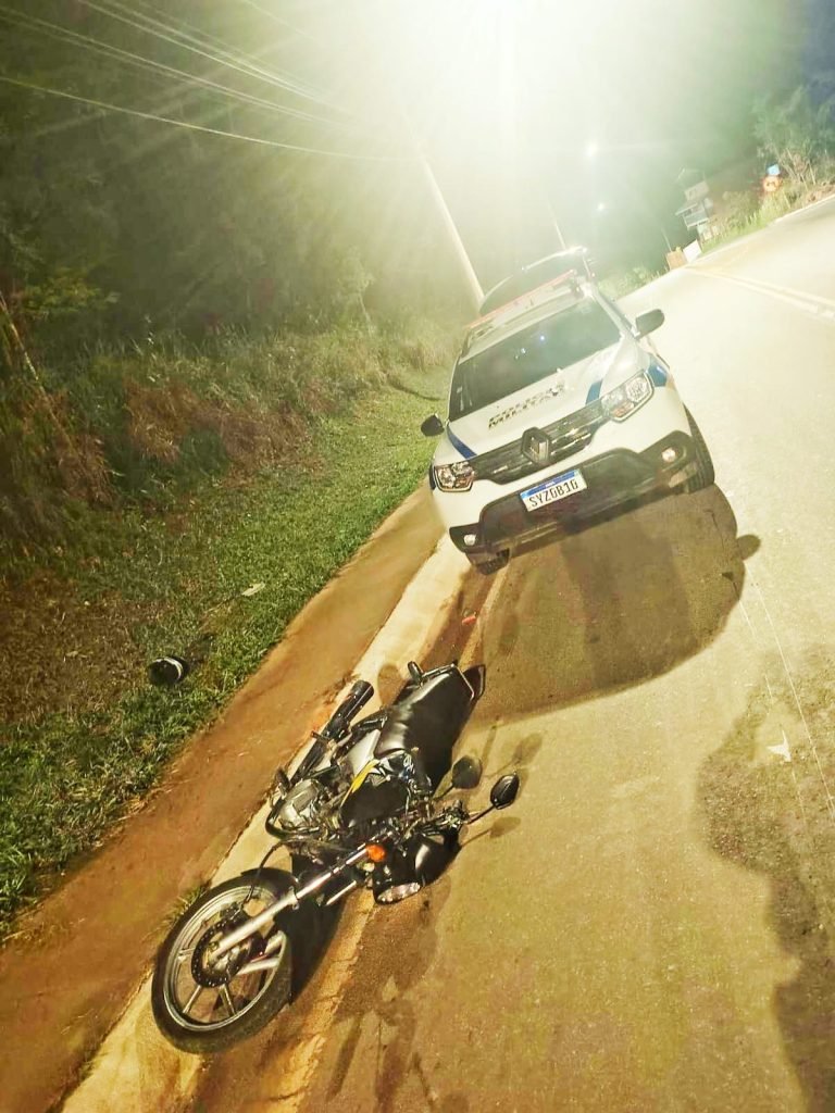Durante patrulhamento, policiais militares abordaram uma motocicleta com dois homens que tentaram fugir, mas foram contidos após perderem o controle do veículo.