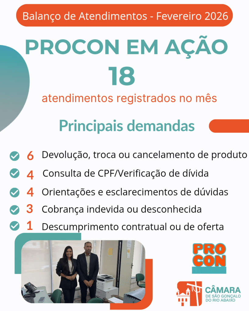 O Procon da Câmara de São Gonçalo do Rio Abaixo segue auxiliando a população do nosso município. O órgão realizou no mês de fevereiro, 18 atendimentos, ofertados pelos profissionais da Casa Legislativa. Dentre as demandas atendidas, não houve necessidade de realização de audiência conciliatória.