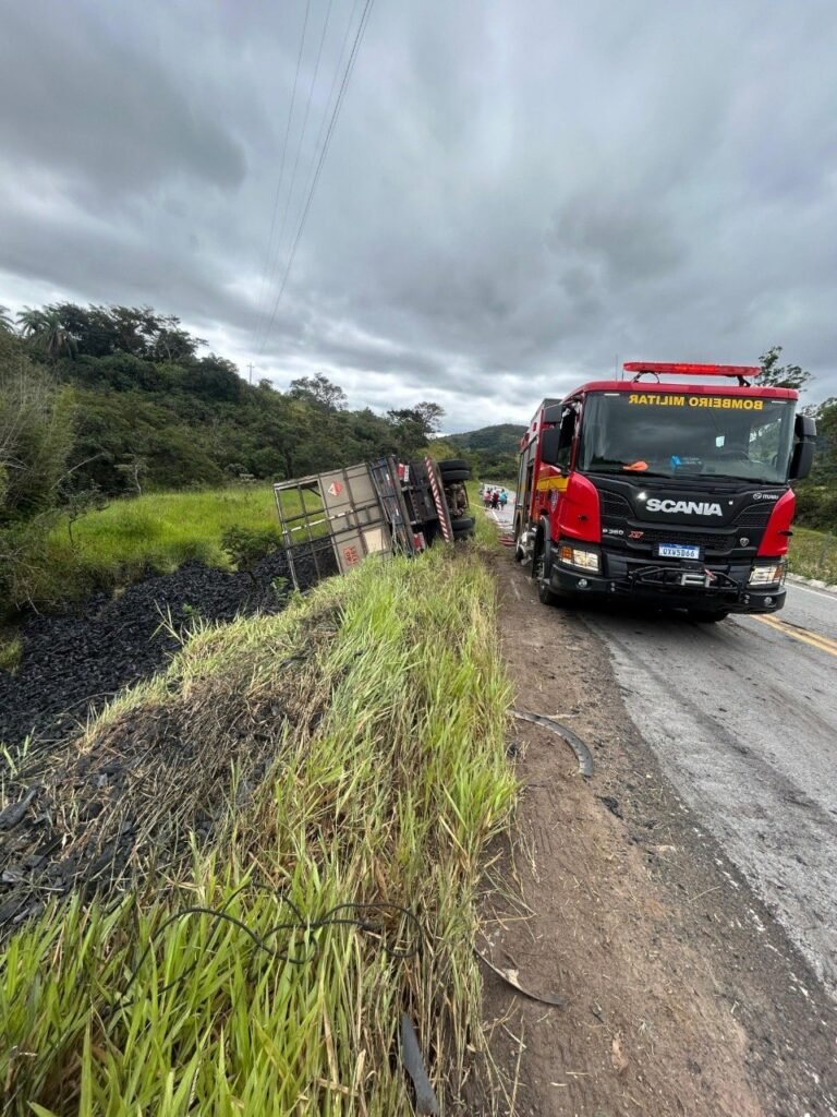 No local, um caminhão carregado com carvão tombou sobre uma caminhonete. O veículo ficou preso sob a carga e seu condutor teve o óbito constatado por um médico do Samu.