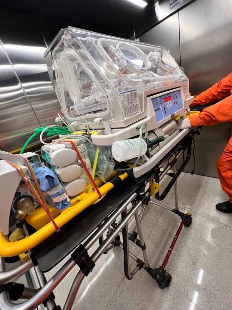 Durante o parto, houve uma intercorrência grave: um dos bebês apresentou parto pélvico, com retenção da cabeça, exigindo a utilização de fórceps para a finalização segura. Na avaliação imediata, a equipe identificou perfuração intestinal, que ocasionou distensão abdominal importante, condição incompatível com o transporte aéreo sem intervenção prévia e com alto risco de óbito.