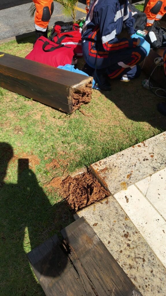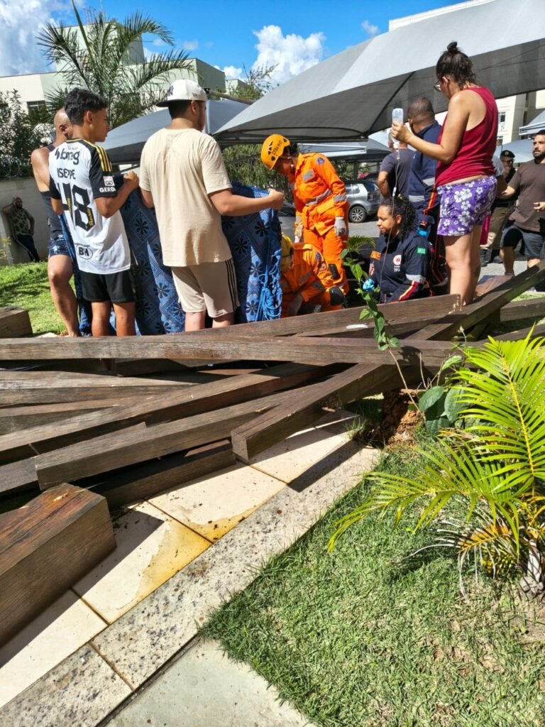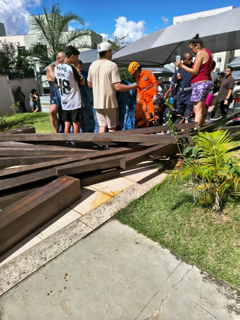 5 crianças atingidas pela pesada estrutura de madeira no conjunto habitacional.