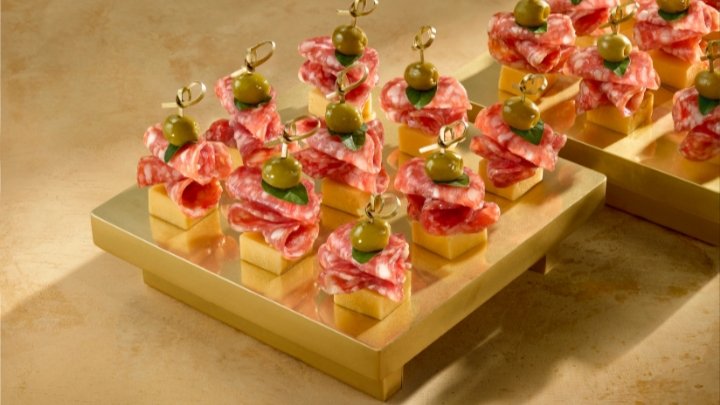 2. Com o palito, comece a fazer a montagem (de cima para baixo): primeiro a azeitona, depois a folha de manjericão, logo 3 fatias de Salame Ouro Perdigão dobradas ao meio e por último o queijo.