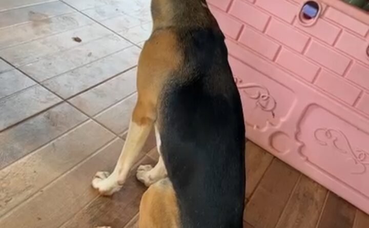 Um cachorro de grande porte colocou a cabeça dentro de uma leiteira e ficou preso. O animal ficou em apuros.
