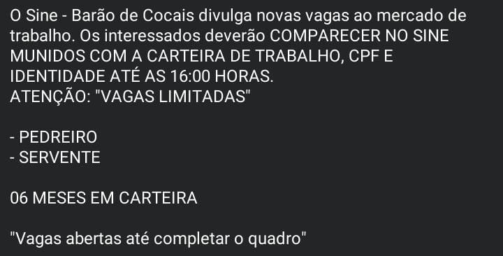 Vagas de Emprego no SINE Barão de Cocais MG Boa sorte aos candidatos