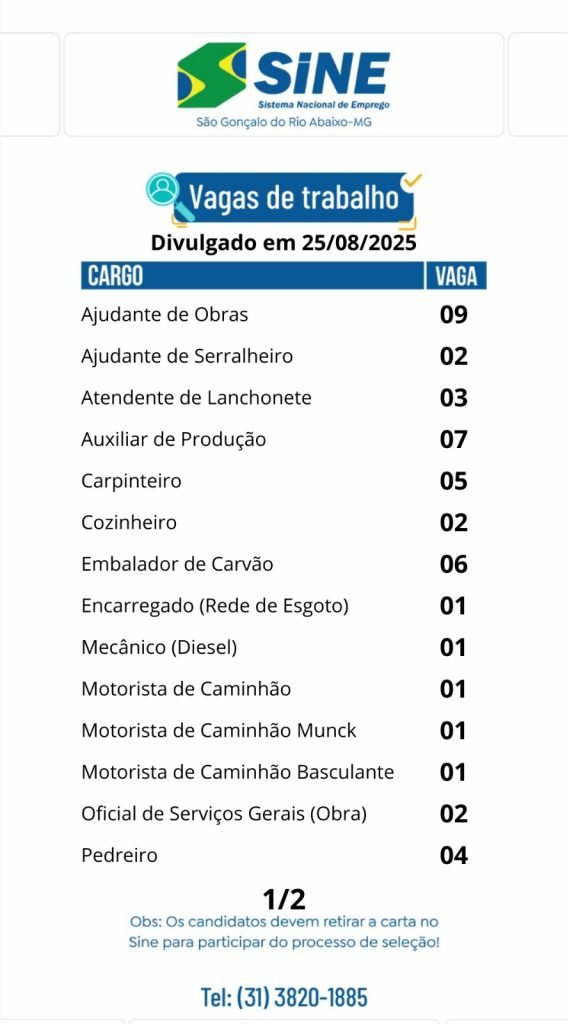 Médio Piracicaba VAGAS DE EMPREGO PARA ESTÁ SEGUNDA-FEIRA (25) NO SINE SÃO GONÇALO DO RIO ABAIXO (#COMPARTILHE) 25 de agosto de 2025 portaldomediopiracicaba@gmail.com Redação