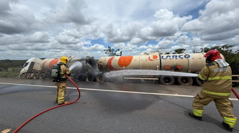 Varjão de Minas: tombamento de carreta bitrem de combustível seguido de incêndio (assista o vídeo)