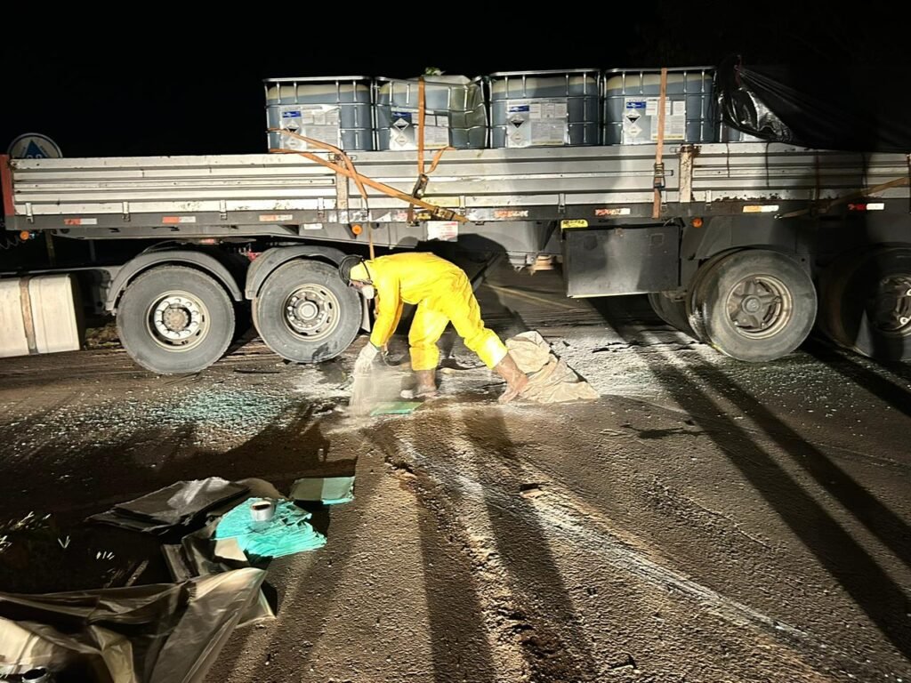 A carreta transportava um produto perigoso classificado como líquido corrosivo tóxico, armazenado em 13 bombonas com capacidade de mil litros cada. Em decorrência do acidente, uma das bombonas foi danificada, ocasionando o derramamento de uma pequena quantidade do produto na pista.