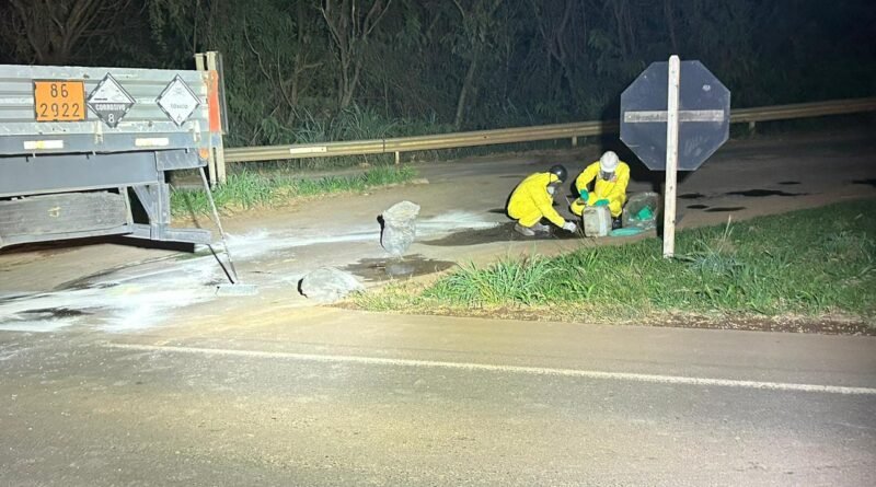 A carreta transportava um produto perigoso classificado como líquido corrosivo tóxico, armazenado em 13 bombonas com capacidade de mil litros cada. Em decorrência do acidente, uma das bombonas foi danificada, ocasionando o derramamento de uma pequena quantidade do produto na pista.