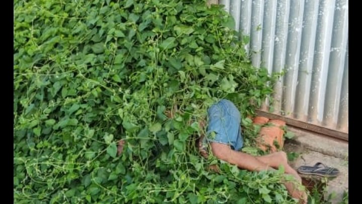 O corpo do indivíduo estava totalmente paralisado, no meio de plantas, como não sou biólogo não faço a mínima idéia de que planta é esta.