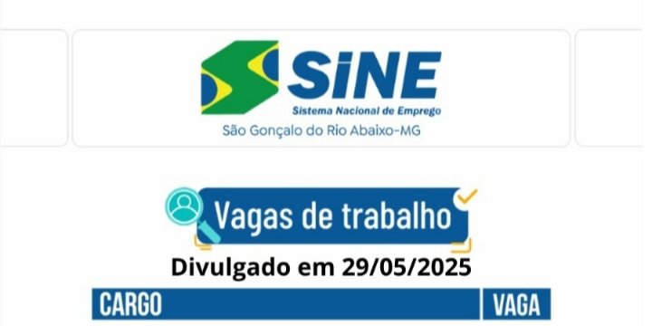 Polícia 326 vagas de emprego para hoje no SINE São Gonçalo do Rio Abaixo (Boa sorte aos candidatos) 29 de maio de 2025 portaldomediopiracicaba@gmail.com Redação