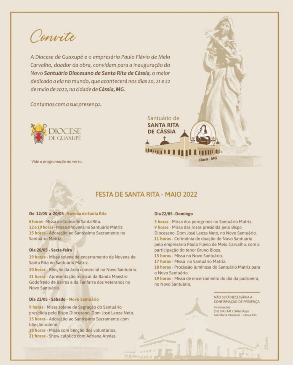 Idealizado pelo empresário Paulo Flávio de Melo Carvalho, o complexo religioso é a realização de um sonho. “Estamos finalizando esta grande missão de construir e entregar o maior Santuário do mundo dedicado à Santa Rita de Cássia. A inauguração será um momento de fé e devoção e a expectativa é fortalecer a cidade de Cássia como um destino de turismo religioso e, um local para se viver uma experiência de fé e evangelização. Estaremos divulgando ainda mais a Santa das causas impossíveis, promovendo o desenvolvimento e trazendo prosperidade para toda a região”, afirma o empresário.