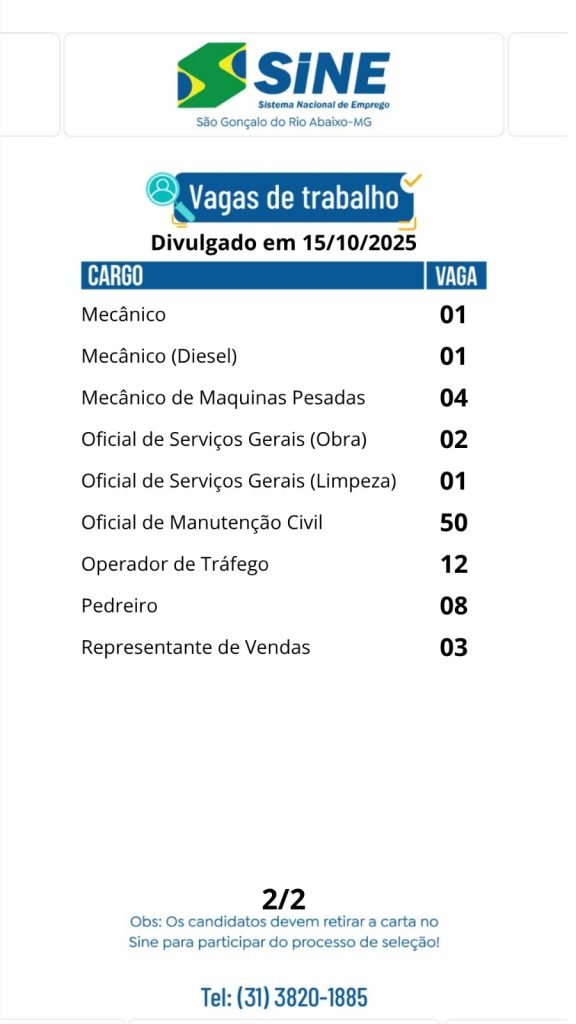 Médio Piracicaba 225 VAGAS DE EMPREGO PARA HOJE QUARTA-FEIRA (15/10) NO SINE SÃO GONÇALO DO RIO ABAIXO (BOA SORTE AOS CANDIDATOS) 15 de outubro de 2025 portaldomediopiracicaba@gmail.com Redação