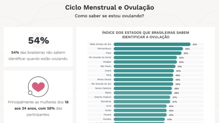 Os dados por estado demonstram que, em Alagoas, 62% das participantes não sabem identificar o período da ovulação. No Rio de Janeiro, e no Espírito Santo, pelo menos 56% das respondentes desconhecem quando ovulam. Já no Rio Grande do Sul e em Santa Catarina, pelo menos 51% das entrevistadas não sabem identificar a ovulação. E em São Paulo, estado com um dos percentuais mais baixos, 49% não sabem identificar quando estão ovulando. Já o Mato Grosso do Sul, é o estado em que menos mulheres sabem sobre a sua ovulação, com 39% das entrevistadas.