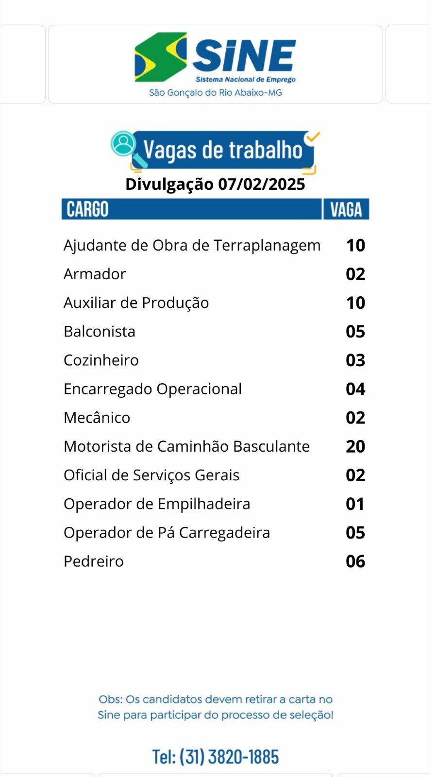 Médio Piracicaba 70 vagas de emprego para hoje no SINE São Gonçalo do Rio Abaixo (Boa sorte aos candidatos) 7 de fevereiro de 2025 portaldomediopiracicaba@gmail.com Redação