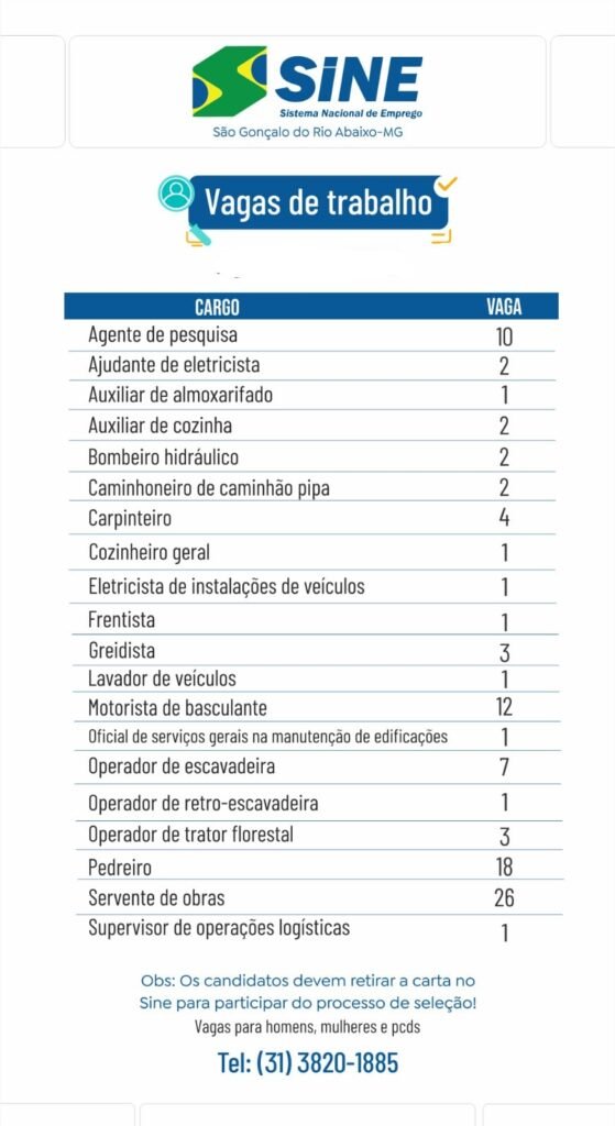 Médio Piracicaba 99 VAGAS DE EMPREGO PARA AMANHÃ 27 DE JULHO NO SINE SÃO GONÇALO DO RIO ABAIXO (#COMPARTILHE) 26 de julho de 2023 portaldomediopiracicaba@gmail.com Redação