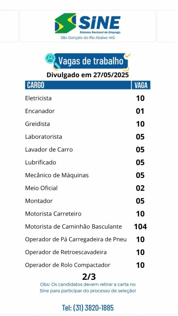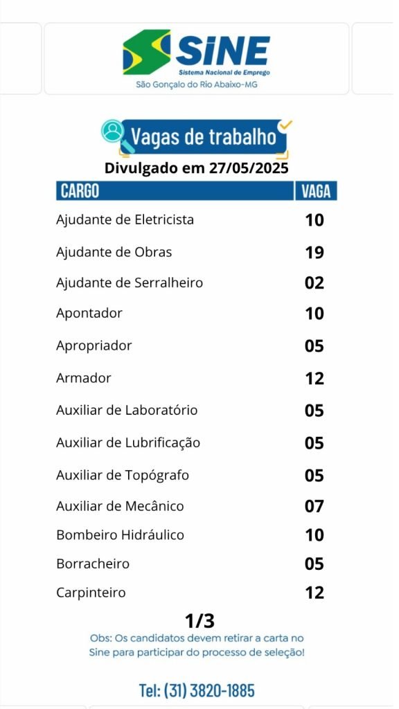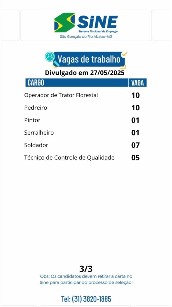 Médio Piracicaba Mais de 300 vagas de emprego para hoje (27/05) no SINE São Gonçalo do Rio Abaixo (Boa sorte aos candidatos) 27 de maio de 2025 portaldomediopiracicaba@gmail.com Redação