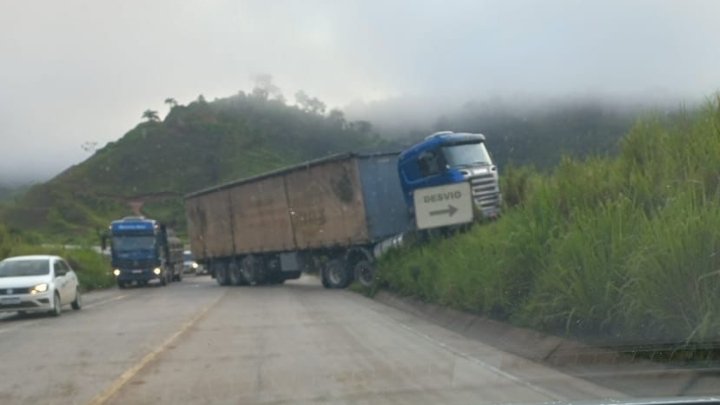 Na manhã desta segunda-feira (12), um acidente com uma carreta Scania foi registrado na BR-381, entre Antônio Dias e João Monlevade. A cabine do veículo bateu e subiu em um pequeno barranco e a carroceria ficou atravessada na rodovia. Não houve vítima.