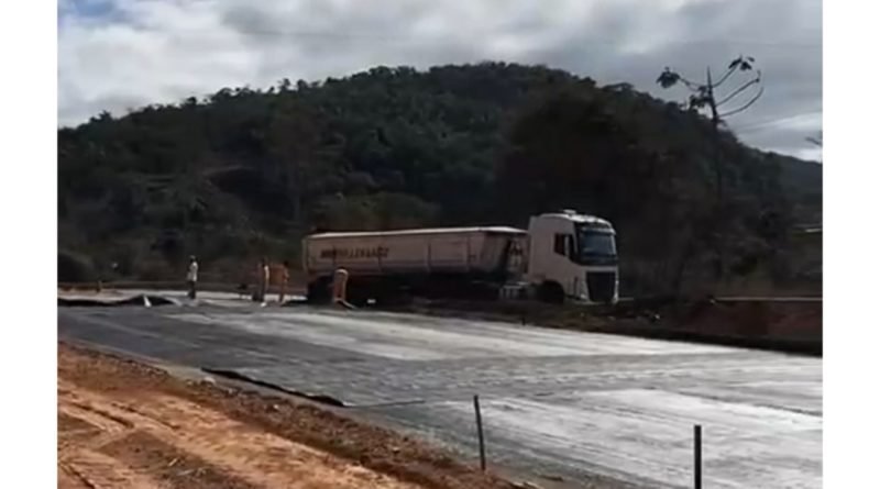 A manta asfáltica sendo colocada no km 321 em Nova Era, local onde houve o estufamento de pista. (Assista o vídeo)