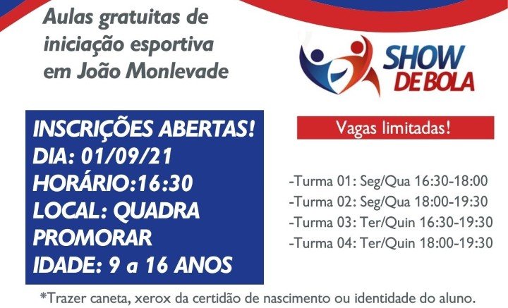 Estão abertas as inscrições para aulas gratuitas de inicialização esportiva do Programa Show de Bola nas modalidades esportivas: vôlei, basquete, futsal e handebol.