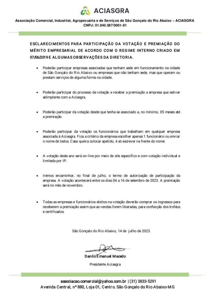 ACIASGRA: ESCLARECIMENTOS PARA PARTICIPAÇÃO DA VOTAÇÃO E PREMIAÇÃO DO MÉRITO EMPRESARIAL