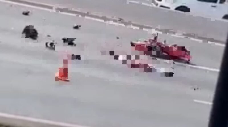 No tarde desta segunda-feira, um motociclista que estava pilotando uma moto de cor vermelha se envolveu em um acidente com outros dois veículos, as imagens mostram o corpo da vítima dilacerada pelo impacto da batida.