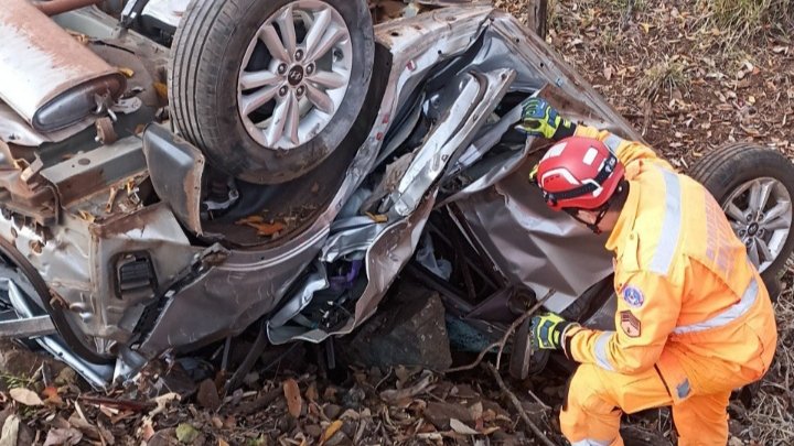 O veículo foi encontrado com as rodas para cima, em um declive acentuado de aproximadamente 3 metros e inclinação de cerca de 80 graus. A vítima estava presa às ferragens, já em óbito evidente.