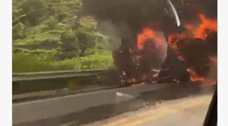 Uma carreta carregada com sacas de café tombou e pegou fogo.