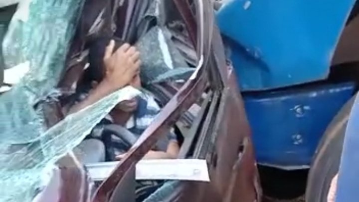 Um veículo Fiat Uno ficou prensado entre dois veículos maiores, sendo um deles um caminhão Mercedes-Benz Azul.