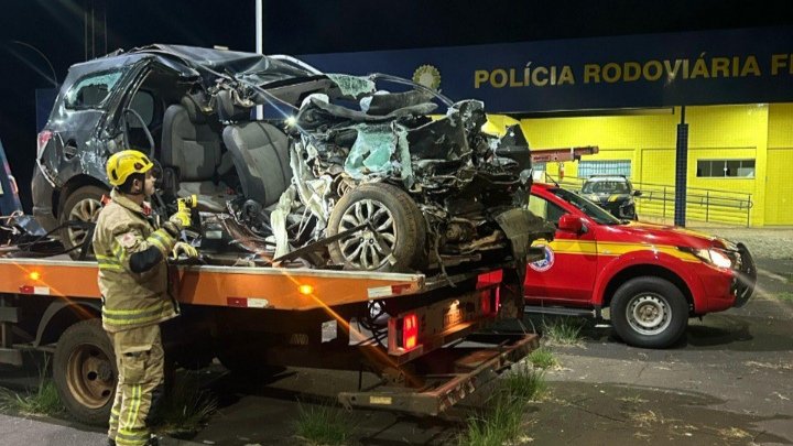De acordo com as informações, um veículo de passeio chocou-se violentamente contra uma carreta que estava estacionada no acostamento da rodovia.