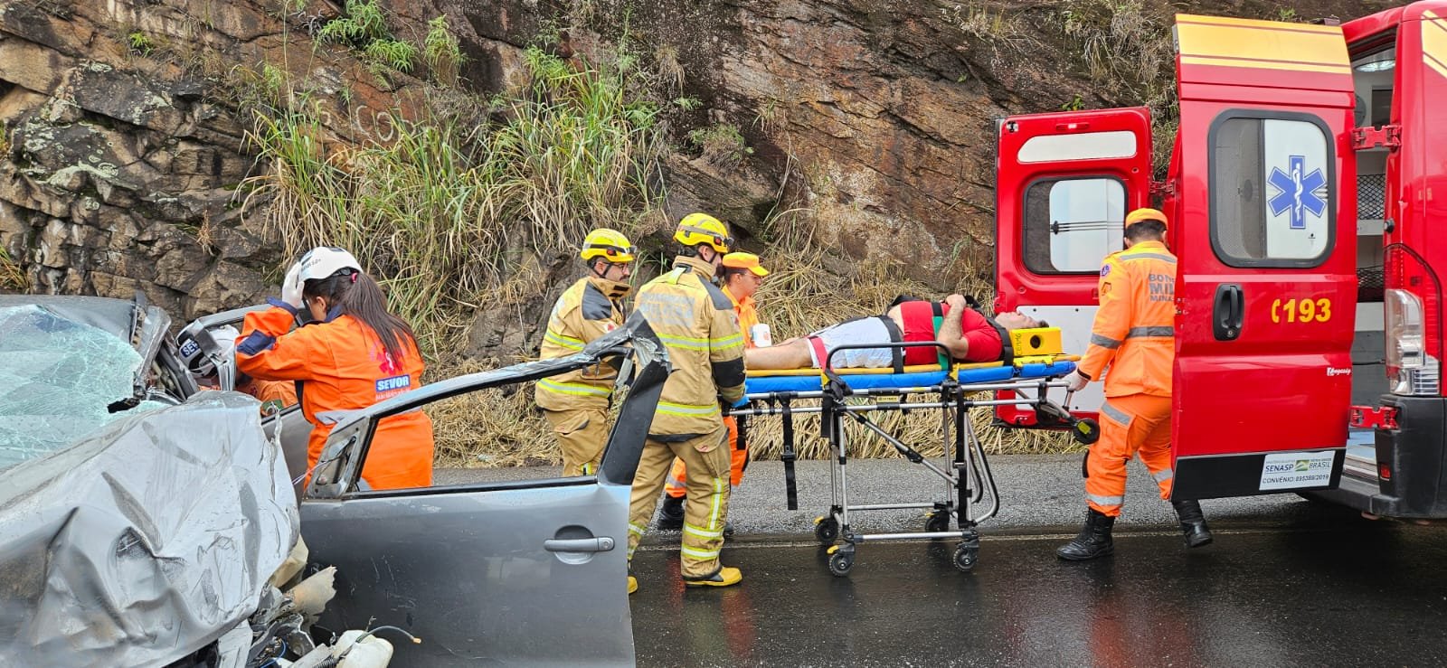 O motorista em estado grave foi socorrido pelo Bombeiro Militar e 3 pessoas pelo SEVOR JM (2 mulheres e 1 criança).