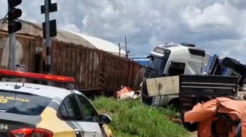 Acidente hoje, carreta avança o sinal bate em trem que descarrila e atinge casa em Rolândia (vídeos)