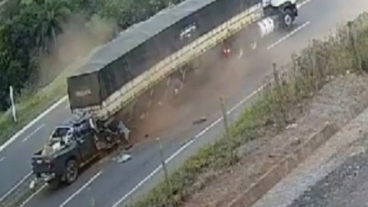 Neste momento, a caminhonete atingiu a traseira da carreta, a carreta estaria com o pisca alerta ligado.