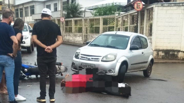 Onde um veículo Ford KA de cor prata chocou-se contra uma motocicleta de cor azul, o motociclista caiu imediatamente no chão sofrendo ferimentos.