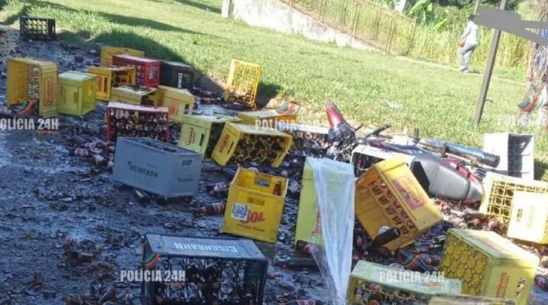 Agora a pouco, por volta de 15 para as 11 horas, uma carga de engradados de cerveja caiu de um caminhão e atingiu uma motociclista.