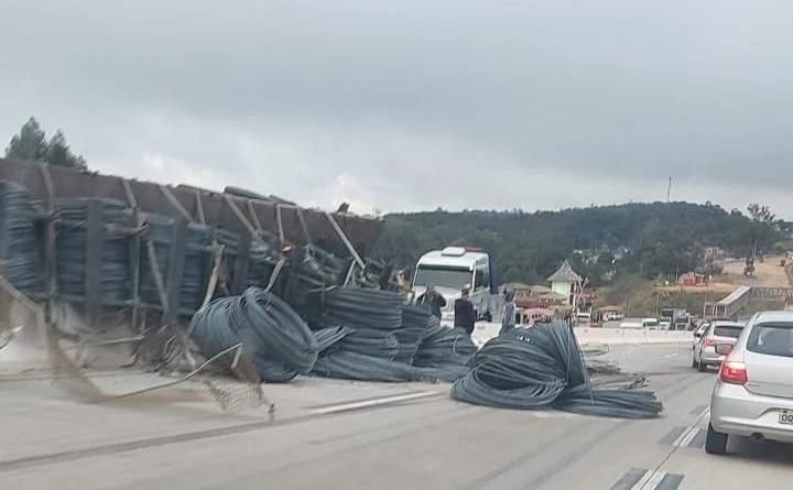 A carreta tombou na mureta que separa as pistas e parte da carga ficou espalhada na pista sentido Vale do Aço.