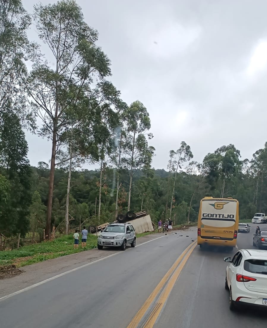Desta vez um caminhão baú carregado com verduras que ia no sentido BH tombou no mesmo local de sempre.