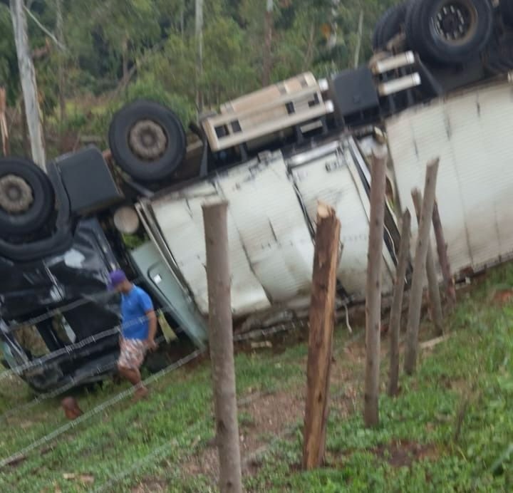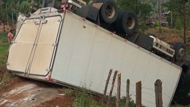 Desta vez um caminhão baú carregado com verduras que ia no sentido BH tombou no mesmo local de sempre.