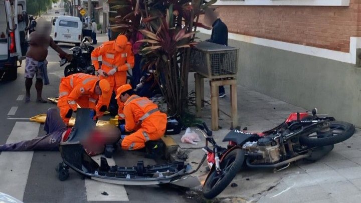 A colisão entre uma motocicleta e um carro aconteceu no cruzamento das ruas Afonso Pena e Sete de Setembro, na região central da cidade.