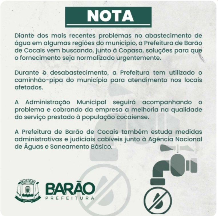 Médio Piracicaba Barão de Cocais emite nota sobre a falta dágua no município 15 de dezembro de 2021 portaldomediopiracicaba@gmail.com Redação