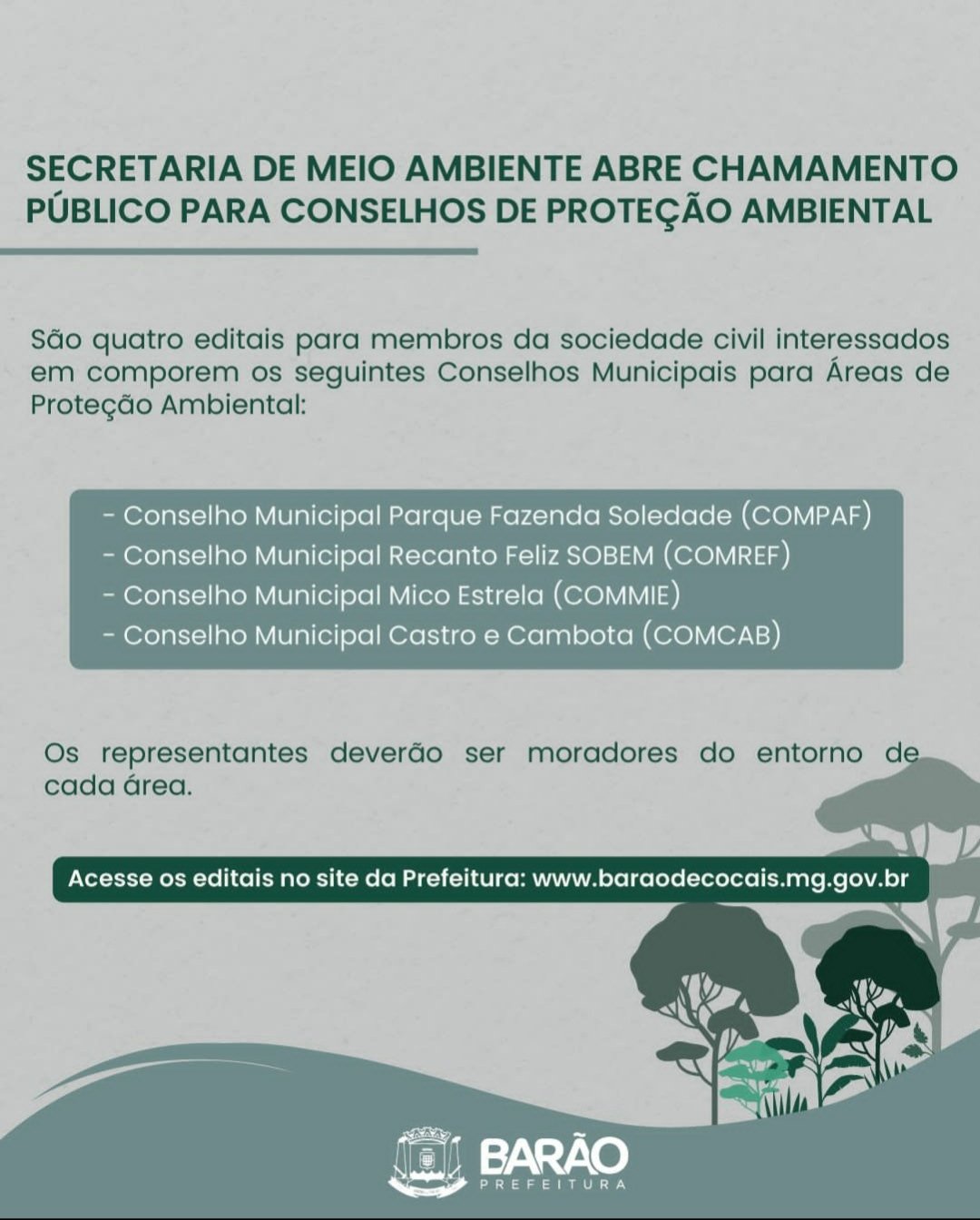 Barão de Cocais MG secretaria de Meio Ambiente abre Chamamento Público para Conselhos de proteção ambiental Secretaria de Meio Ambiente abre Chamamento Público para Conselhos de proteção ambiental