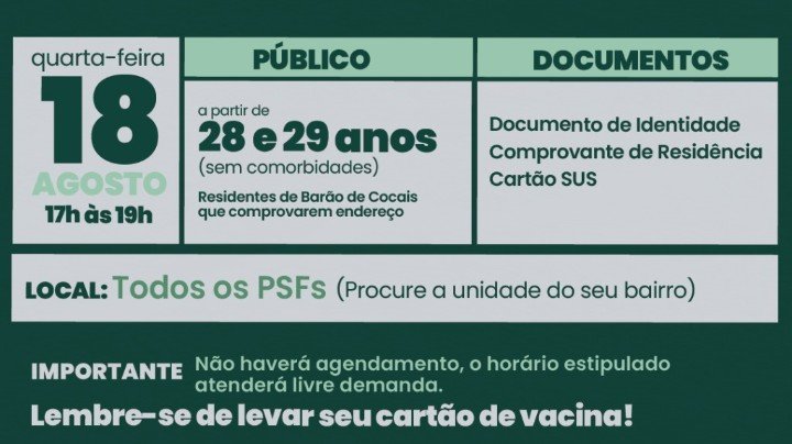 ??⚕️ E a vacinação contra a Covid-19 segue avançando, agora para os cocaienses a partir de 28 e 29 anos de idade!