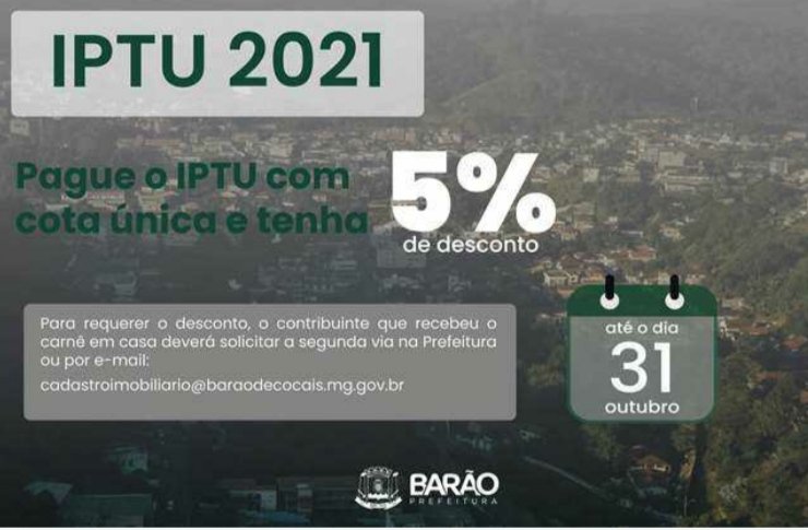 A Prefeitura de Barão de Cocais, por meio da Secretaria Municipal de Fazenda, informa que encerra, em 31 de outubro, o prazo para os contribuintes efetuarem o pagamento do Imposto Predial e Territorial Urbano (IPTU) em cota única com 5% de desconto.