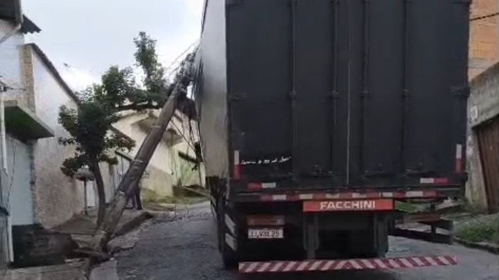 Segundo o solicitante, caminhão bateu em um poste, que veio a cair em cima do mesmo, com risco ao condutor que que estava dentro do veículo.
