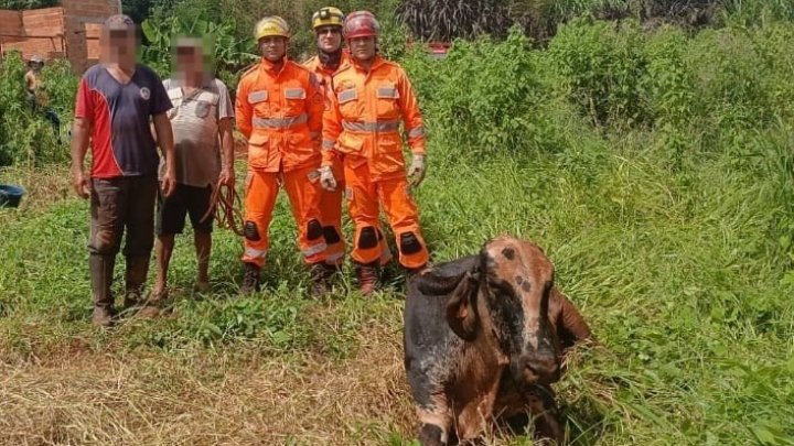 No local, tratava-se de uma vaca que havia caído em uma cisterna em construção, com 3 metros de profundidade.