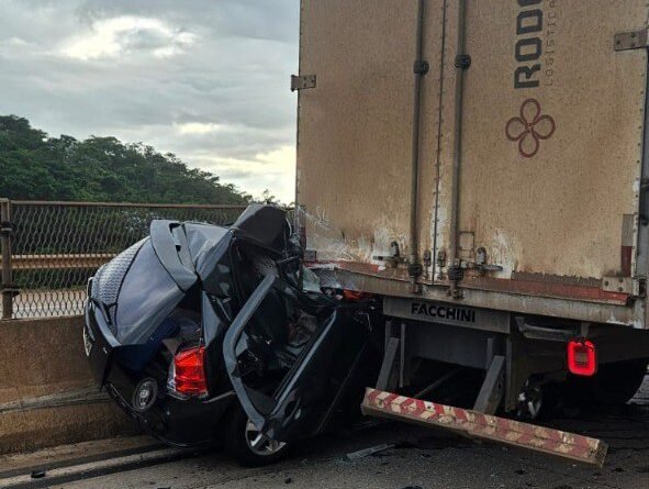 Militares do Corpo de Bombeiros aguardam o trabalho da perícia da Polícia Civil, que já está no local, para retirar a vítima do veículo. A Polícia Rodoviária Federal também atende essa ocorrência.
