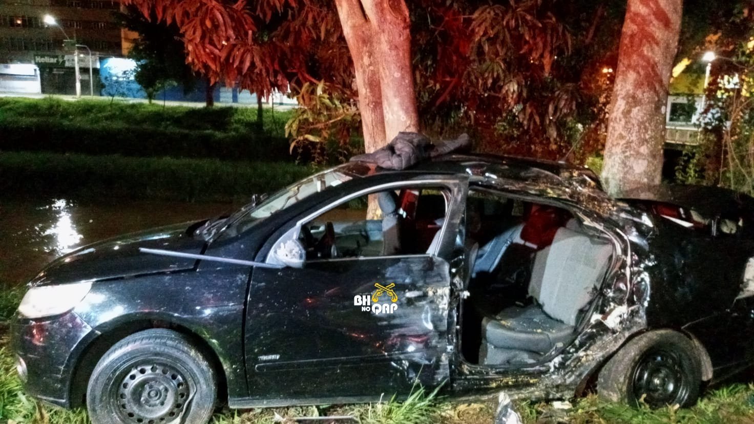 No local, a guarnição do Corpo de Bombeiros Militar constatou que o VW Voyage licenciado em Juiz de Fora chocou-se contra uma árvore. Segundo relato do condutor, ao passar no desnível do cruzamento da Avenida Brasil com a Ponte do Ladeira, perdeu o controle da direção do veículo que rodou na pista, atingindo a calçada e uma árvore. No veículo, haviam cinco ocupantes, sendo dois óbitos, um em estado grave politraumatizado repassado à equipe do SAMU e outros dois deambulando fora do veículo. Compareceram também ao local para registrar a ocorrência, uma guarnição da Polícia Militar e um Perito da Polícia Civil.