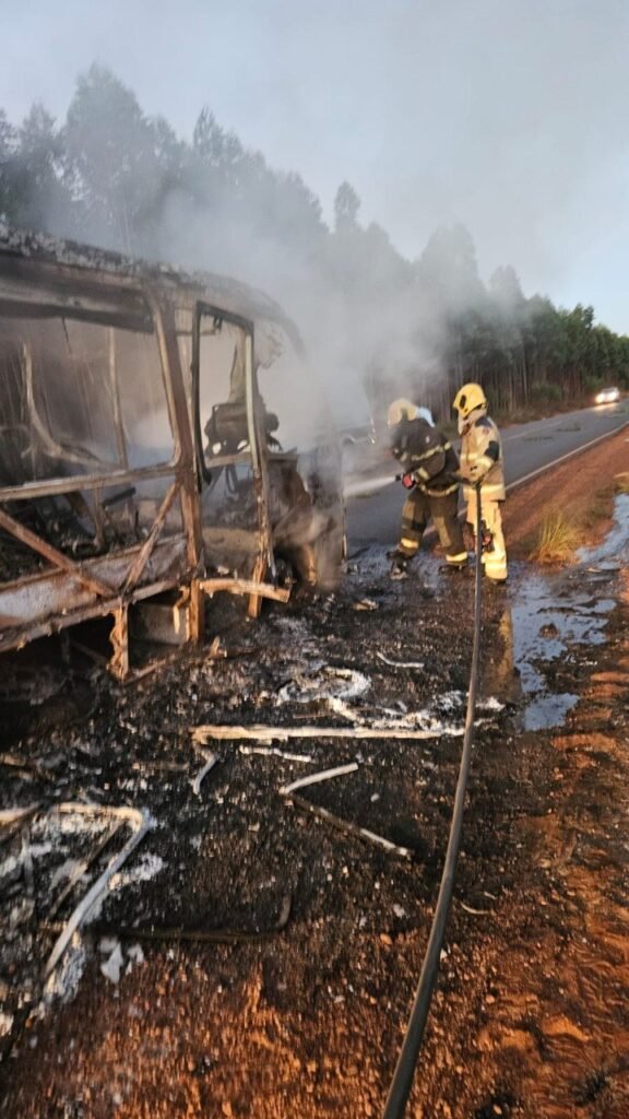 BOMBEIROS ATENDEM OCORRÊNCIA DE INCÊNDIO EM ÔNIBUS DE TIME DE FUTEBOL NA RODOVIA MG-214