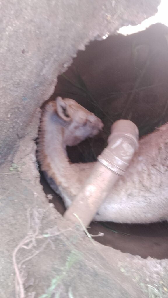No local, tratava-se de um jumento que havia caído em um bueiro com aproximadamente 50 cm de diâmetro, ficando preso a cerca de 2,5 metros de profundidade.